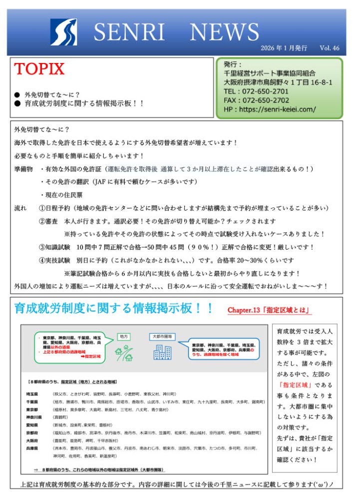 千里ニュースの2026年1月号を発行しました!今回の内容は ①海外で取得した免許を日本で使えるようにする『外免切替』について ②育成就労についての情報掲示板『「指定区域」とは』...