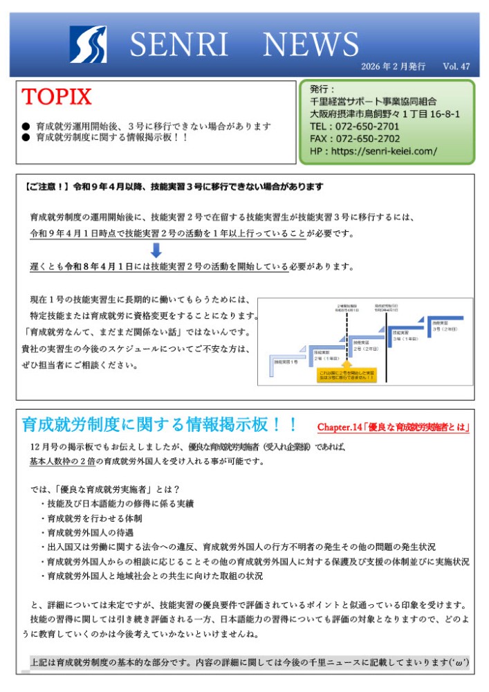 千里ニュース 2026年2月号を発行しました!今回の内容は ①育成就労運用開始後、3号に移行できない場合があります ②育成就労についての情報掲示板『「優良な育成就労実施者」とは』...